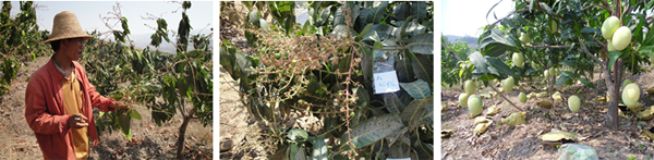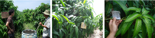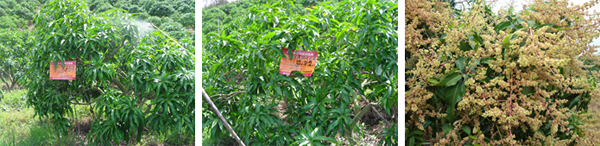 海南三亞福田公司種植戶李伯真18889889828,在2010年6月4日,使用15%國光多效唑可濕性粉劑對金煌芒、澳芒、貴妃芒(樹冠直徑3.5米,樹直徑14cm,土埋60g15%國光多效唑可濕性粉劑;樹冠直徑4.5米,樹直徑14cm,土埋15%國光多效唑可濕性粉劑80g)進(jìn)行土埋處理。后期表現(xiàn)效果:控梢穩(wěn)定,不“沖梢”;葉片濃綠加厚;枝梢生長短壯。圖為福田公司果園。