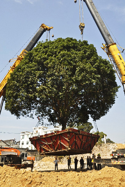 20名作業(yè)人員,連續(xù)一周的緊張工作,40余萬元搬家費用。2014年10月23日上午12時10分,在兩臺大型起重機巨臂的牽引下,總重達62噸的“桂花王”連同底部的箱梁緩緩落入預(yù)定的坑穴,岳西縣城居民廣泛關(guān)注的“桂花王”順利移動60余米,成功入住新家。