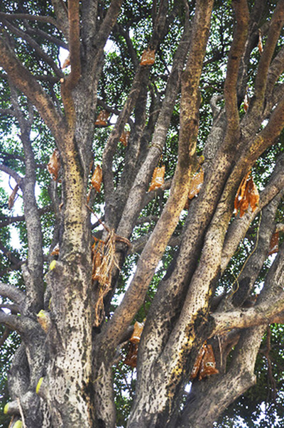 從10月15日開始開挖,到今天成功搬家,再到下一步的“生根發(fā)芽”,如何確保這棵桂花王順利適應(yīng)新環(huán)境?來自四川農(nóng)大的碩士王天龍介紹,從15日開始,技術(shù)人員定期往樹葉上噴灑抑制蒸騰劑,以減少水分蒸發(fā)。同時使用營業(yè)液為枝干補充能量。“目前我們使用的營養(yǎng)液已經(jīng)超過300公斤,你看樹干上一袋袋,掛的都是營養(yǎng)液!蓖跆忑埿χf。