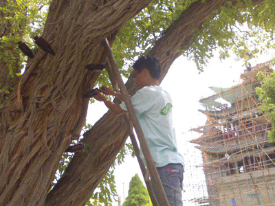 這兩棵古樹差不多有三層樓高,樹根盤枝錯節(jié),樹體朝一側(cè)傾斜著,被工作人員用鋼管支架精心支撐住。據(jù)了解,2013年,永寧縣林業(yè)局邀請自治區(qū)林業(yè)廳、銀川市園林局專家對這兩棵刺槐的樹齡進行鑒定,專家根據(jù)兩棵樹的高度、直徑,結(jié)合樹種的正常生長速度進行估算,結(jié)論是兩棵刺槐樹齡均已過百年。