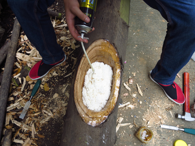 3、防腐材料涂抹好后,放置一段時間,晾干后,用聚氨酯泡沫填縫劑從底部開始填充樹洞(圖3);