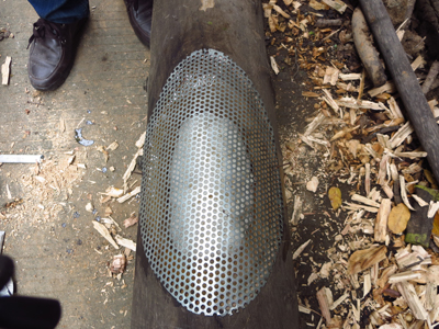 1、在樹干上用銼刀挖出一個樹洞,將樹洞邊緣及底部修整平(圖1);